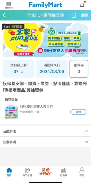 在全家購票或取票會送水的兌換券和抽沖繩自由行五天四夜