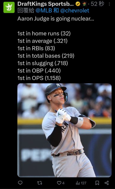 推 yaes111: 五月 .361/.479/.918, 14 HR, 27 RBI 六月少三轟但多打10 07/03 23:41