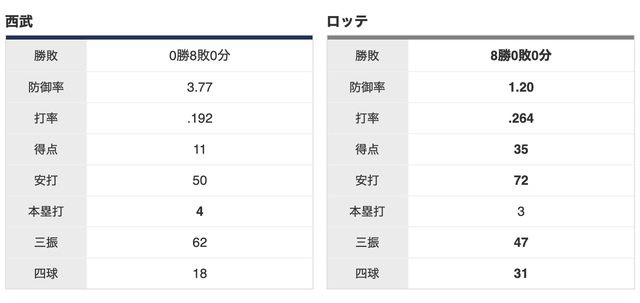 羅德 8 勝,西武全敗