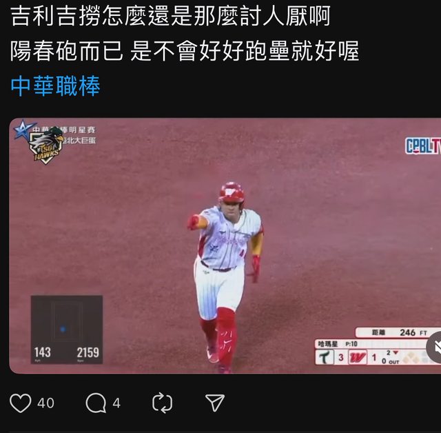 推 kaiyukuo: 當年彭政閔拿著球棒低調跑壘也被嫌過,只要打全壘打就是 07/06 11:15