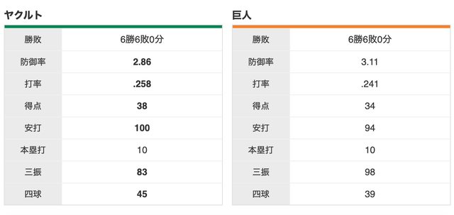 巨人 6 勝,養樂多 6 勝