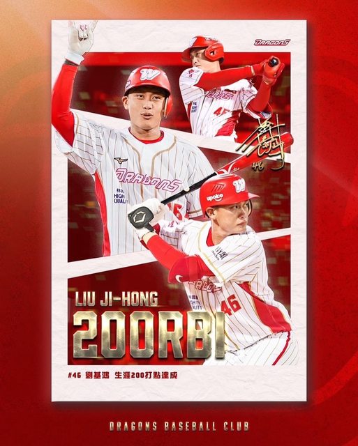劉基鴻今日三局下敲出帶有1分打點的高飛犧牲打,完成個人中職生涯200打點的里程碑!