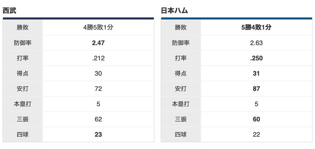 火腿 5 勝,西武 4 勝,1 和