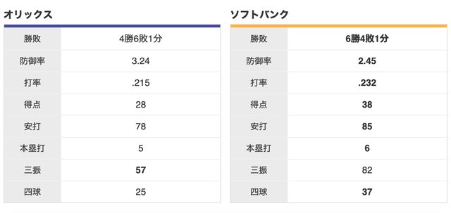 軟銀 6 勝,歐力士 4 勝,1 和