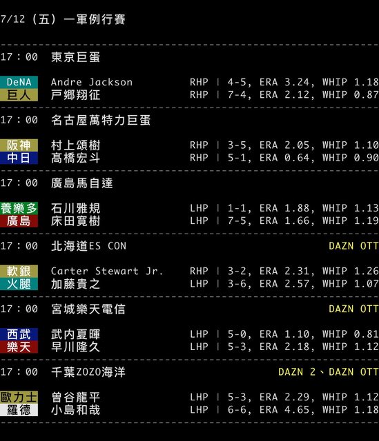 標題[情報] NPB 7/12 預告先發