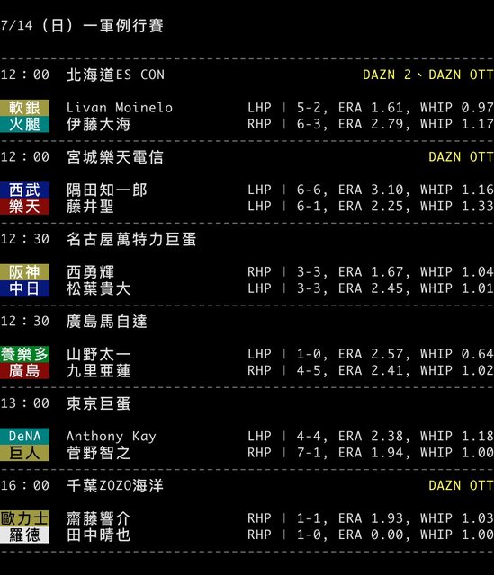 7/23 (二) 17:30 Game1 北海道 ES CON FIELD