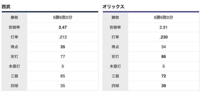 歐力士 6 勝,西武 6 勝