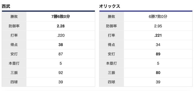 西武 7 勝,歐力士 6 勝