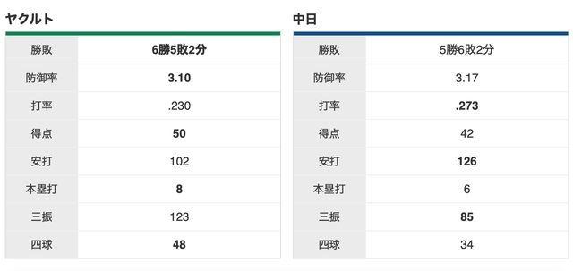 養樂多 6 勝,中日 5 勝,2 和