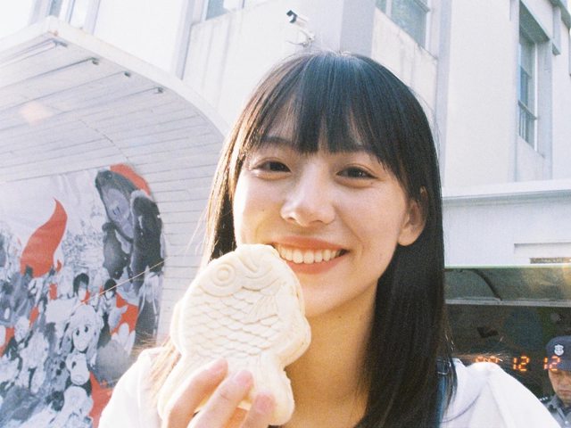白天自然太陽光,黑長髮可愛的笑容,手上拿著鯛魚燒