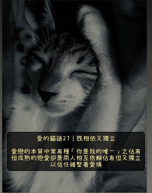 「愛的貓語」是根據心理師近30年的觀察、實務經驗及愛情心理學的研究成果,發展而成的短文,我認為,如果能從01貓話,細細思量貓話,有這個認知及行為,往向成熟和諧的戀人不遠矣