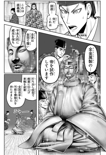 高師直做了一個金屬製天皇,全身包覆金箔,輕量附車輪可全國移動探視人民