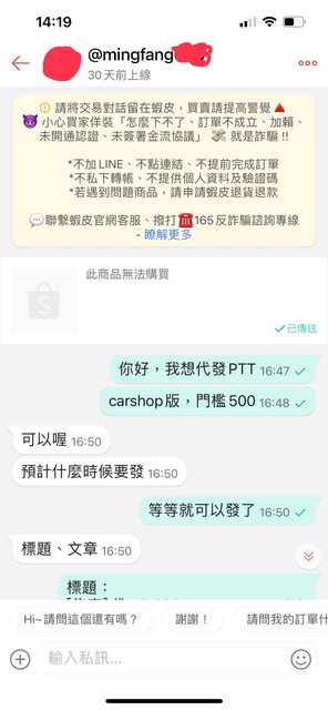 → colinham: 約而同剛好在蝦皮找上同一個帳號代發?101.9.101.64 05/31 20:39