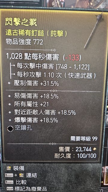 物 品:18.5%易傷 +21所有屬性 18.5%近距離敵人傷害18.5%爆傷