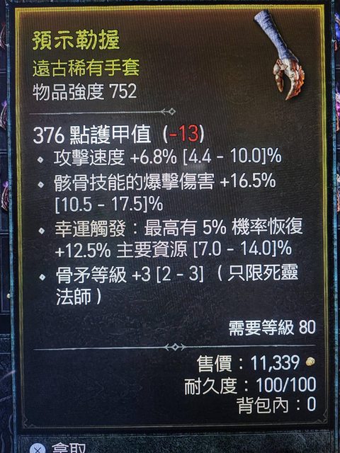 標題[競標] D4 S1 死靈手套 骨矛3/骸爆/攻速/觸回能