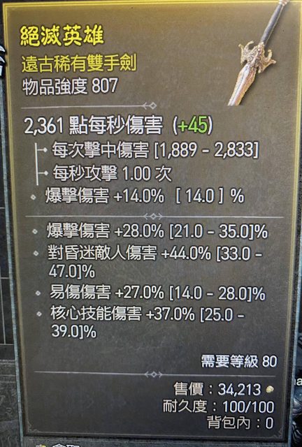 標題[競標] D4S1 807雙手劍 爆傷 易傷 核心傷害
