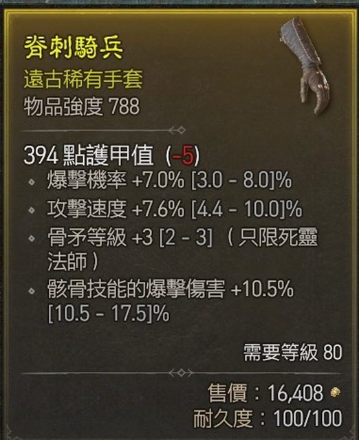 物 品:遠古手套788 爆率7% 攻速7.6% 骨矛+3 骨骸爆傷10.5%