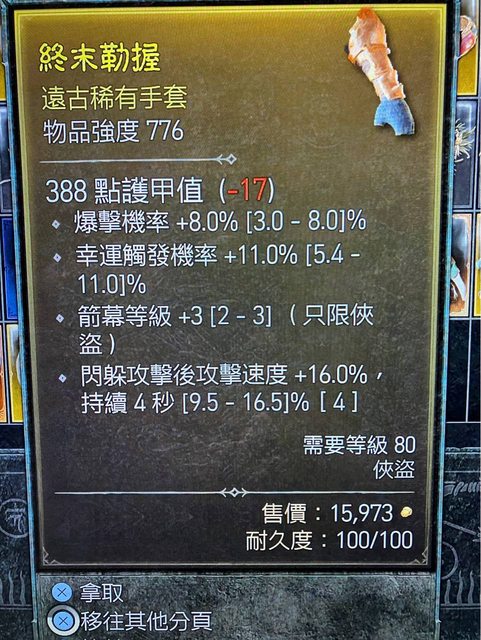 標題[競標] D4 S1手套 爆率頂/幸運頂/閃後攻速近