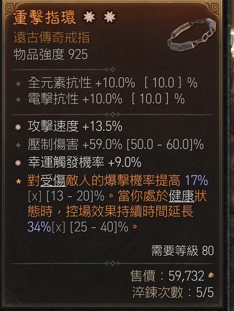 : 物 品:(太古)攻速(13.5%) (太古)幸運觸發(9%) ; 壓制(59%)