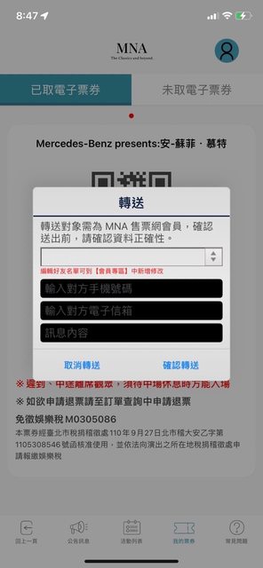 交易方式:匯款入帳後立即轉出電子票(需下載MNA牛耳藝術APP,APP名為MNA售票)