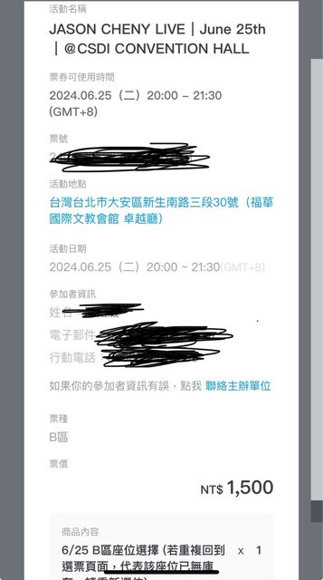 標題[售票] Jason Cheny 6/25(二)B區2張連號