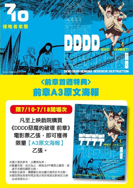 凡購買《DDD惡魔破壞 前章》07/10~07/18電影票1張,即可兌換領取【前章A3原文海報】