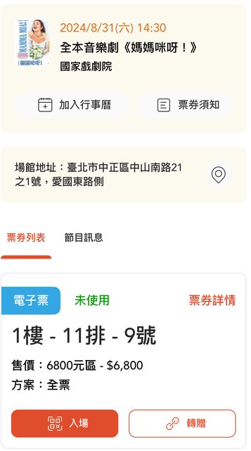 標題[售票] 8/31 14:30音樂劇Mamma Mia一樓中間