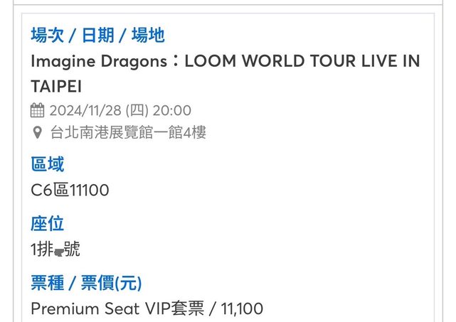 標題[售票] Imagine Dragons Premium 11100 C6區