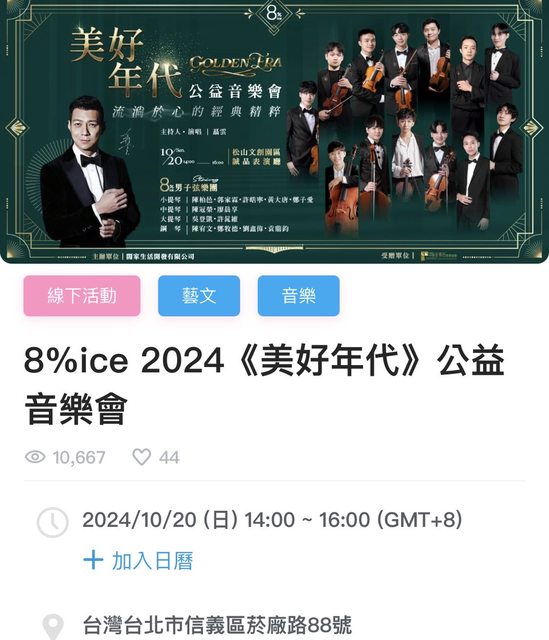 標題[贈送] 10/20 美好年代公益音樂會-松菸表演廳