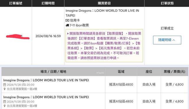 標題[售票] imagine dragons 搖滾A1站區4800 2張