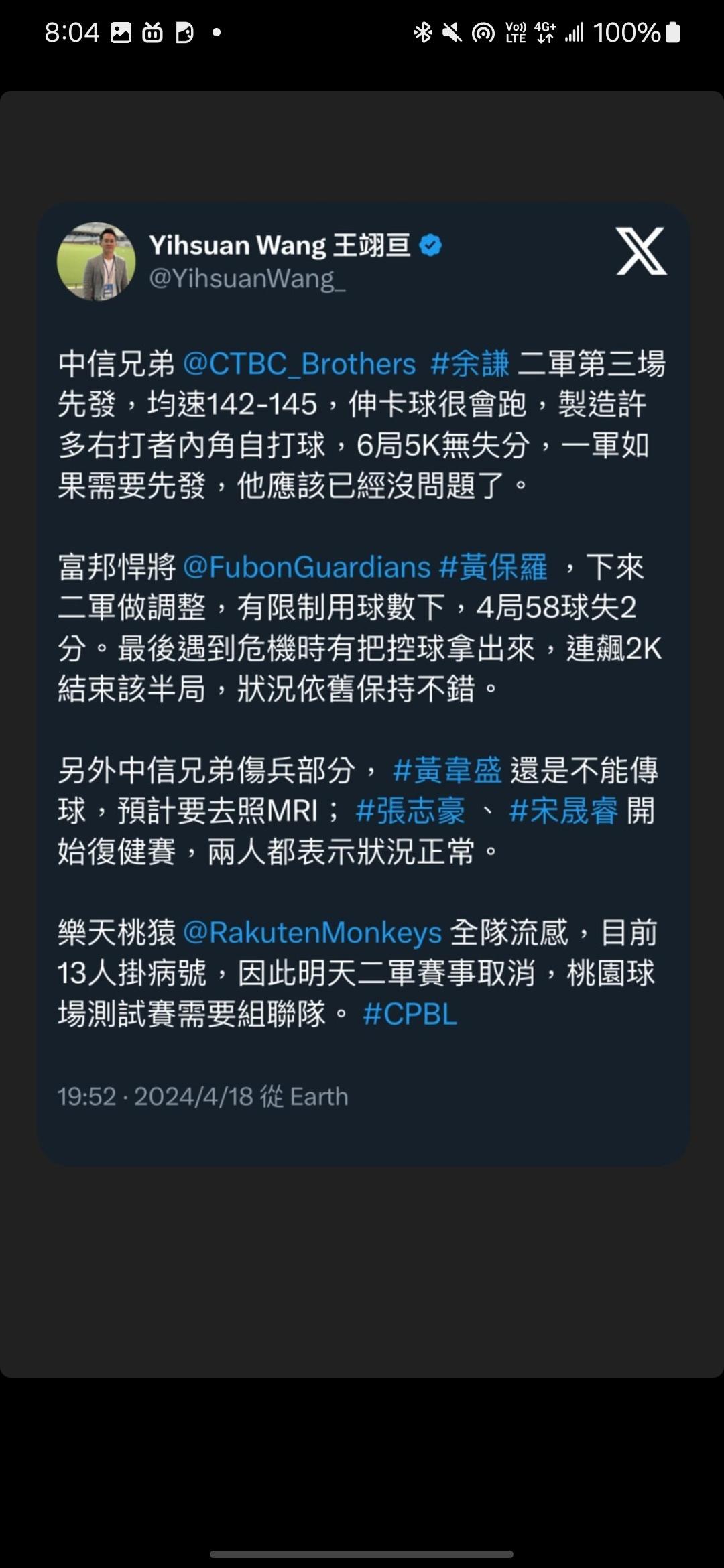 → taisam23: 傳球 感覺又更不舒服 所以球團安排去仔細檢查 04/18 20:08