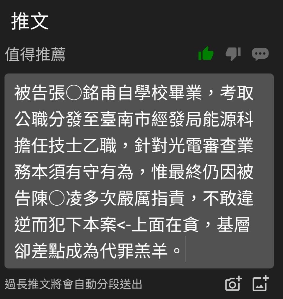 被告張○銘甫自學校畢業,考取公職分發至臺南市經發局能源科擔任技士乙職,針對光電
