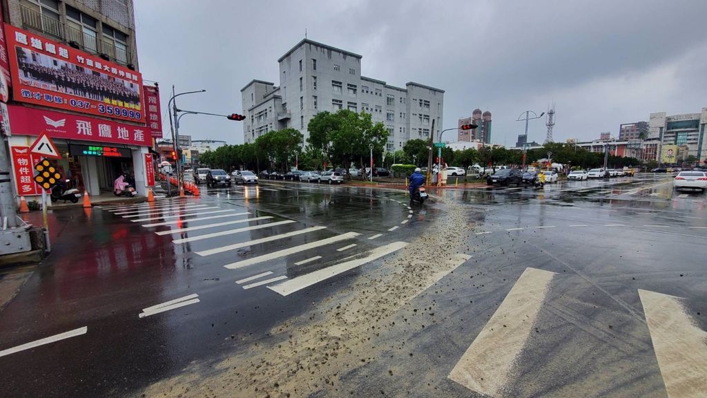 苗栗縣政府旁的市府東路與縣府路口,昨(1)日下午發生混凝土洩漏事故。一輛混凝土