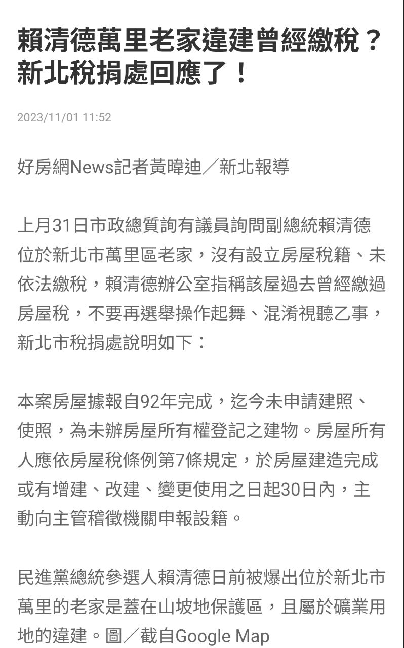 其中也公告賴總統在去年11月的財產申報,賴總統有一位於台南市安平區金城段的土地及建