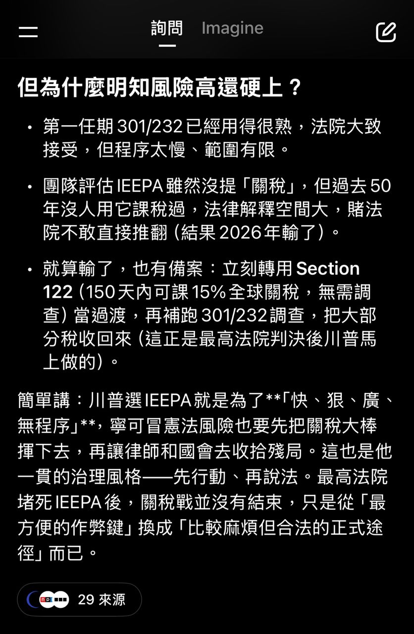 換句話說就是不好用,所以川普當初才冒著違憲賠款的風險也要用IEEPA徵稅(然後果然