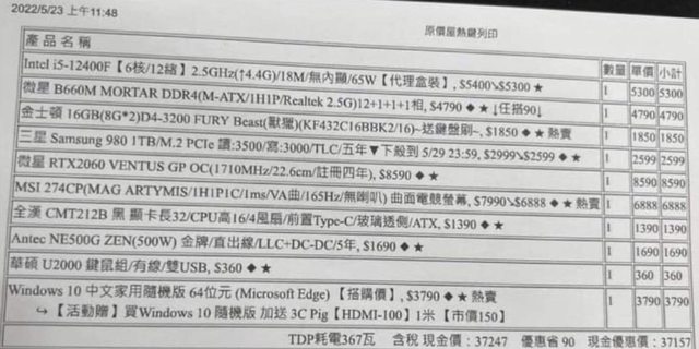 Cpu:i5-12400f 2022/5/23開始三年保固