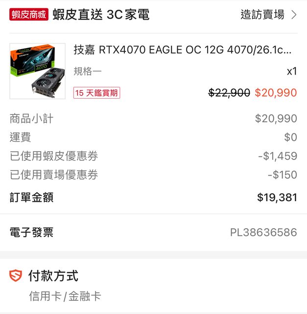 顯卡2023/6/26從蝦皮直送商城購入