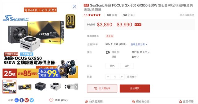 3. 海韻 Seasonic Focus GX-850W (ATX2.53, 非ATX3.0)
