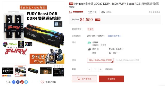 2. 【暫售】Kingston 32Gx2 DDR4-3600 FURY Beast RGB