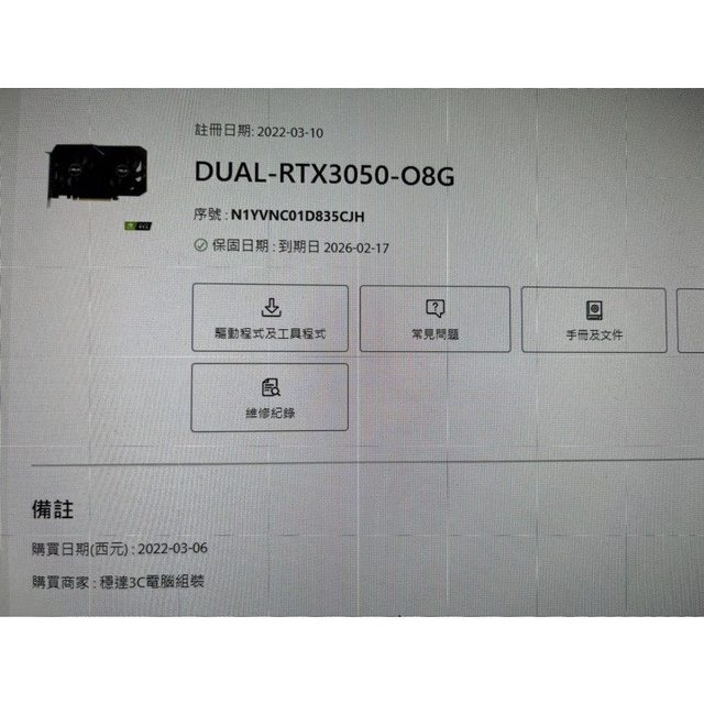 標題[賣//] ASUS 華碩 DUAL-RTX3050-O8G 3050