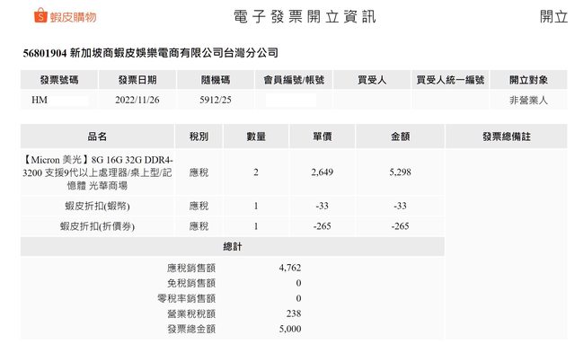 ◎品樣狀況:2022/11/25 於蝦皮商域的光華德總電腦購入,捷元代理商公司貨,2支記憶體