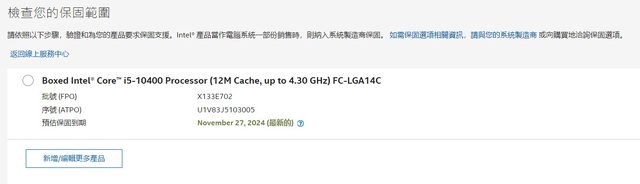保固依CPU上批號及序號經官網查詢到2024/11/27