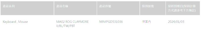 ◎硬體型號: ASUS ROG Claymore II RGB 無線機械式鍵盤 (RX青軸)