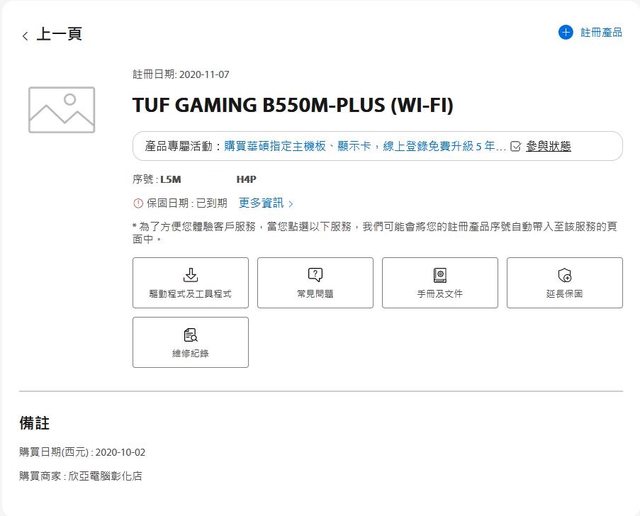 2.2020/10/02購自欣亞。登錄五年保,但顯示2020/11/07登錄,保固日期依華碩為主