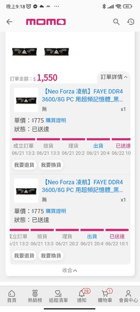 ◎硬體型號: neo forza DDR4-3600 8g x 2 條