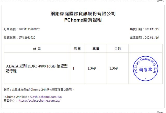 1.2023/11/15 PCHome24h購入
