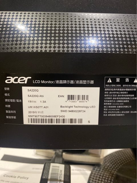 1.Acer SA220Q 22型 IPS 薄邊框電腦螢幕 2020年中購入/2019.11出廠/已過保