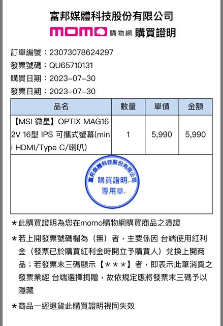 1. 20230730 Momo購買 近全新 有盒及訊號線