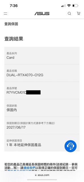 級換下故售出,查詢華碩保固到2027/08/17
