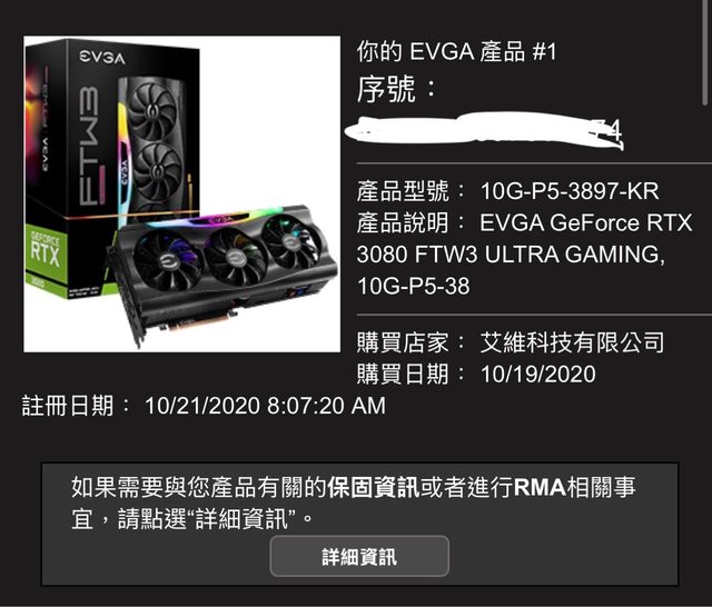 ◎硬體型號: EVGA 3080 ftw3 ultra gaming(10g-p5-3897-kr)